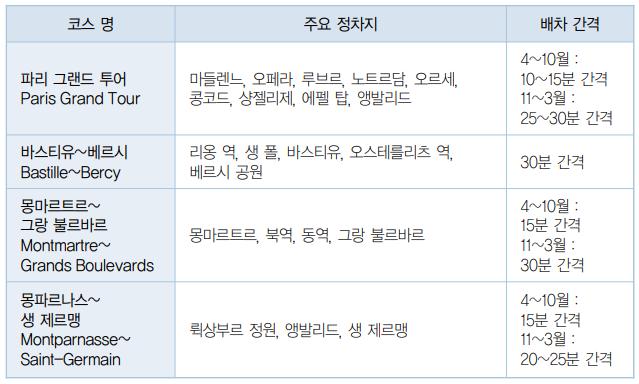한국에서 운영하고 있는 시티투어 버스와 비슷한 개념이라 생각하면 된다. 이동하는 버스 안에서 파리 시내의 주요 명소들을 안내받을 수 있으며, 개인이 자율적으로 시간을 할애하여 투어를 할 수 있다는 장점이 있다. 기본적으로 4개의 노선이 운영되고 있으며 투어패스 하나면 4개 노선 모두를 이용할 수 있다.