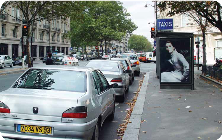 돈을 구멍으로 밀어 넣어야 한다. 파리의 택시들은 법적으로 택시 정류장 근처 150m 내에서는 택시 정류장에서만 승객을 태울 수 있다. 택시 정류장에서 줄을 서서 기다리고 있는 승객들을 보호하기 위한