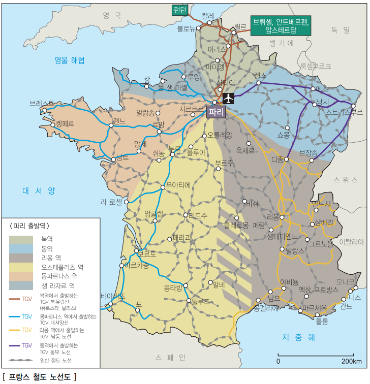 시속 300km의 TGV는 매우 빠르고 편리하게 목적지까지 갈 수 있다는 장점이 있다. 철도망은 남동쪽의 항구 도시 마르세유에서 유로스타를 통해 영국까지, 또 스페인으로 연결되는 남서쪽의 보르도에서부터 벨기에 및 독일과의 국경 지대인 북쪽의 릴르까지 전국에 걸쳐 깔려 있다. TGV는 일반 기차와는 비교가 안 될 정도로 빠르지만 대신 약간의 예약금을 내야 하며, 승객이 많은 시간대에는 추가 요금을 내야 한다. 티켓 구입은 기차역의 카운터 서비스(자동판매기)를 이용한다. 터치 스크린으로 각 기차 구간의 요금 및 시간을 확인할 수 있으며, 영어로도 안내가 된다. 다음 단계로 넘어가기 전에 취소하려면 빨간 버튼을 누르면 된다.