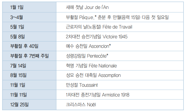 공휴일에는 대부분의 상점과 박물관이 문을 닫는다. 그러나 레스토랑은 영업하는 곳이 많다. 5월에는 특히 국경일이 많으므로 여행 시에 주의하도록 한다.