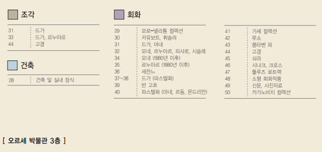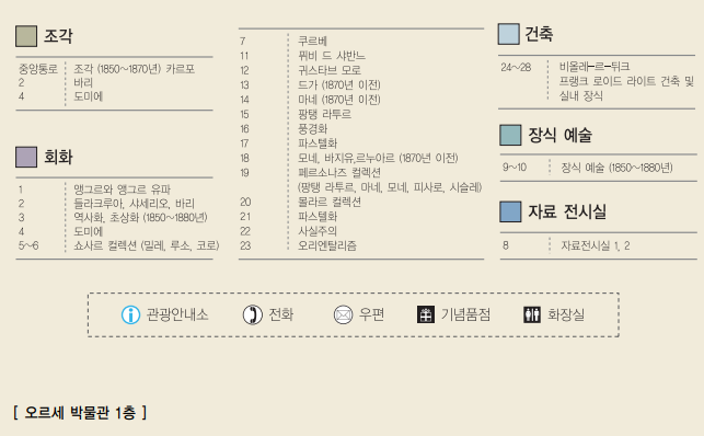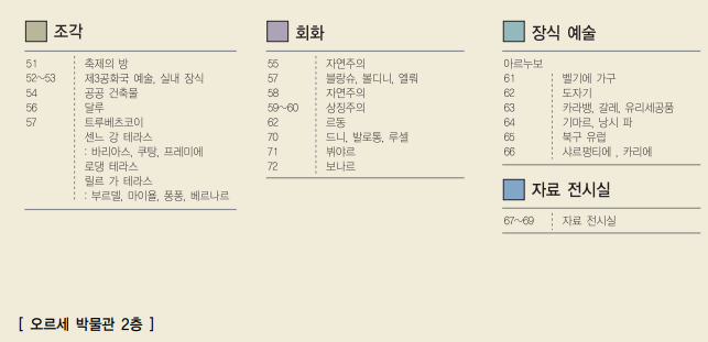 센느 강을 경계로 루브르 박물관과 마주보고 있는 오르세 박물관은 원래 약 1세기 전인 1900년 만국박람회 당시 기차역과 호텔로 쓰기 위해 지어진 건물이었다. 대대적으로 개조를 해 박물관으로 문을 연 것은 1986년이다. 2월혁명이 일어난 1848년에서 제1차 세계대전이 끝나는 1918년까지의 미술작품과 19세기 후반을 지배했던 문학, 음악, 사진, 영화 및 건축과 장식 예술품 일체를 보관 전시하고 있다. 오르세 박물관은 따라서 고대 이집트에서 19세기 중엽의 낭만주의까지의 유물과 예술품을 보관하고 있는 루브르 박물관과 20세기 국립 현대 미술관인 퐁피두 센터를 연결하는 중간 지점에 위치한 박물관이다. 루브르부터 관람을 하고 이어 시대순으로 오르세, 퐁피두 센터를 보는 방법이 가장 고전적인 순서가 되겠지만, 고대와 현대의 중간 역할을 하는 오르세 박물관부터 보는 것도 한 가지 방법이다. 어느 쪽으로도 갈 수 있기 때문에 더 좋은 방법인지도 모른다.