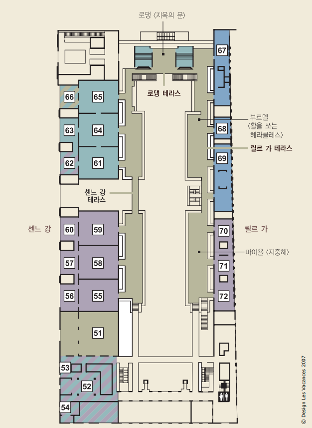 이런 대원칙에 입각해 플랫폼으로 쓰였던 중앙홀은 자연 채광을 위해 다시 사용되었다. 그리고 양쪽에 2개 층의 발코니를 두어 위에는 인상주의 작품을, 그 아래에는 관전에서 입선한 작품들과 자연주의, 상징주의, 1900년 이후의 회화 등 비교적 빛에 덜 민감한 그림들과 조각을 배치하게 된다. 그래서 오르세 박물관에 들어가게 되면 19세기라는 이름의 거대한 기차역에 들어온 것 같은 인상을 받게 된다. 아마도 이런 이유로 오르세 박물관이 가장 아끼는 소장품이 모네의 인상주의를 대표하는 그림인 <생 라자르 역>인지도 모른다. 따라서 관람은 1층의 중앙홀에 전시된 1870년까지의 작품을 좌우로 왕래하며 본 후, 박물관 끝에 있는 계단을 통해 가장 위층인 3층으로 올라가 인상주의를 보고 내려오면서 마지막으로 로댕, 마이욜, 부르델 등의 조각이 놓여 있는 2층 발코니를 보는 것이 가장 바람직하다. 이 방식은 소장품을 시대별로 감상할 수 있는 이점도 있다.