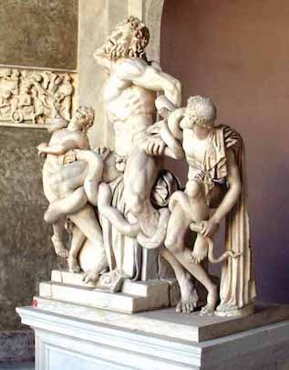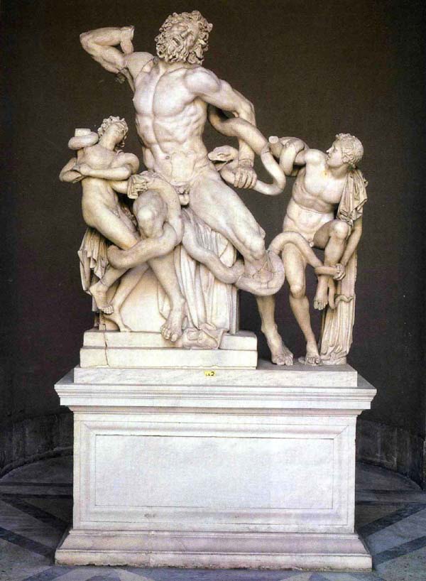 티투스 황제의 궁전 인근에서 1506년 한 농부가 발견한 높이 2.45m의 이 조각은 기원전 1세기경 그리스 로도스 섬의 조각가가 제작한 것으로 아폴론 신의 제사장 라오콘이 맞이한 비극적 최후를 표현하고 있다. 라오콘이 아폴론 신전에서 부인과 사랑을 나누는 것을 본 아폴론은 거대한 두 마리의 뱀을 풀어 제사장의 두 아들을 죽인다. 위기에 처한 아들을 구하려고 뛰어든 라오콘마저 죽고 만다. 트로이 전쟁 당시, 제사장이었던 라오콘은 트로이 시내로 목마를 들여오는 것에 반대하면서 목마를 불태워버려야 한다고 주장했었다. 그가 죽자 트로이 시민들은 목마를 받아들이는 것을 신의 뜻으로 알고 목마를 시 안으로 끌어온다.