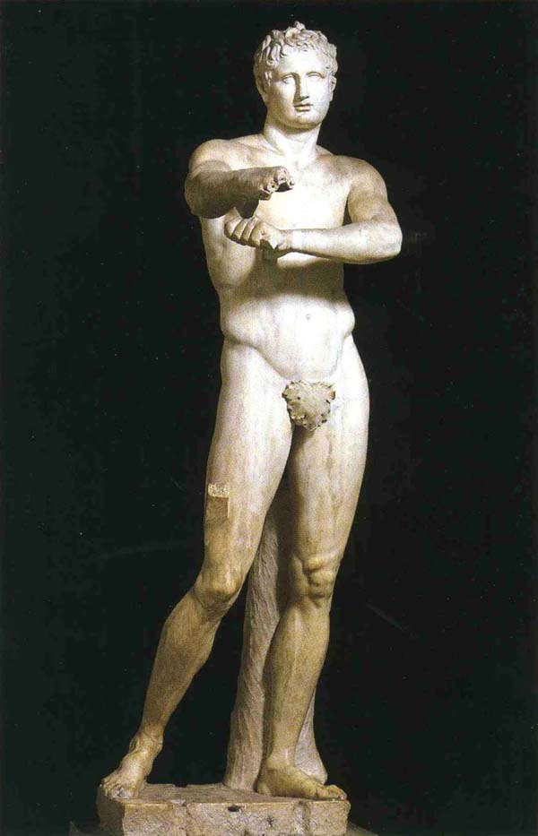 기원전 4세기에 활동했던 그리스 청동 조각가 루시포스의 작품을 서기 1세기 로마 제국 당시 대리석으로 모각한 작품이다. 경기를 마친 한 선수가 몸을 씻고 있는 모습을 조각했다. 흔히 미술사에서 팔등신 비례를 처음 조각에 적용한 조각가로 알려진 루시포스의 이 작품은 이상화된 행동이나 영웅을 묘사한 것이 아니라 일상적인 움직임을 사실적으로 묘사한 뛰어난 작품이다. 인체의 정확한 비례, 피곤이 묻어나는 표정, 힘을 준 왼쪽 다리와 한 발 뒤로 물러선 오른쪽 다리의 움직임과 균형 등 인체에 대한 해부학적 지식에 기초한 자연주의적 경향을 읽을 수 있다.
