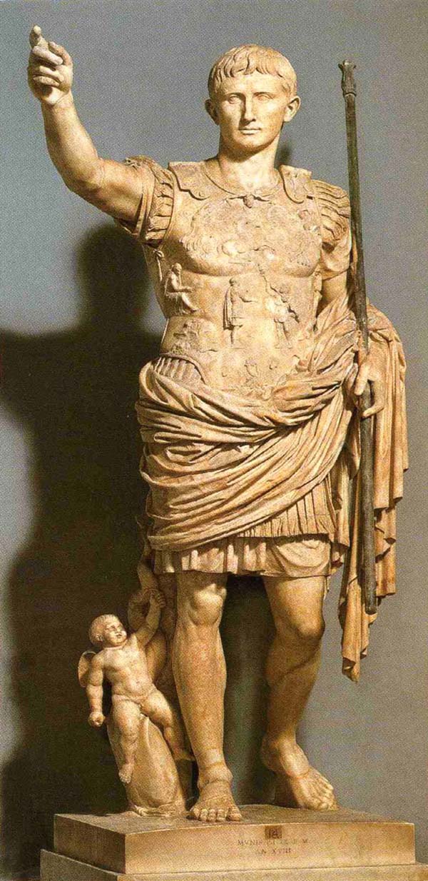 로마의 첫 번째 황제였던 아우구스투스 황제의 이 조각은 19세기에 황제의 부인인 리비아의 묘가 있는 프리마 포르테 인근에서 출토되었다. 원래는 기원전 20년경에 청동으로 제작된 원본을 대리석으로 모각한 것으로 추정된다. 가슴을 가리고 있는 흉갑에 조각된 부조가 압권이다.