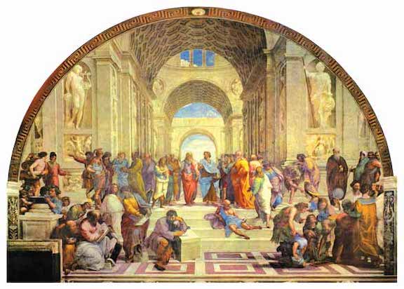 이 그림은 라파엘로의 그림 중 마돈나와 함께 가장 널리 알려진 그림이다. 치밀한 계산 아래 그려진 상상화이지만 웅장한 규모와 조화 등은 보는 이들을 압도한다. 엄격하게 준수된 원근법과 정교하게 연출된 무대 같은 공간 속에, 인물들은 한결같이 진지하고 숭고한 자태로 등장한다. 서로 살았던 시대가 달랐지만 시간을 초월해 이렇게 성인과 학자들이 한꺼번에 회합한 장면을 두고 정신분석가 프로이트는 꿈의 메커니즘을 설명하기도 했다. 이 그림에서는 레오나르도 다 빈치의 깊이 있는 심리 묘사와 미켈란젤로의 역동적인 인체 표현을 라파엘로가 종합하려고 했음을 알 수 있다.