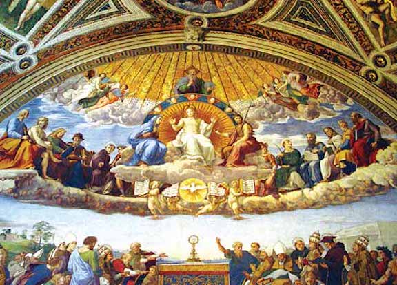 종교의 승리를 묘사한 벽화 위에는 신학에 대한 우의적 그림이 올라가 있고, <아테네 학당> 위에는 철학이 올라가 있다. 파르나스에는 시 즉, 아름다움에 대한 우의가 올라가 있다. 이 방에는 <아테네 학당> 이외에도 <성체 논쟁>이라는 또 하나의 걸작이 있다. 예수의 성체 상징을 두고 좌우에서 교부와 교황들이 마치 서로 성체를 차지하려는 듯한 태도를 보이고 있어 붙여진 제목인데, 그림을 오해한 나머지 잘못 붙여진 제목이다. 천상의 가장 높은 곳에는 성부가 있고 그 밑에 동정녀 마리아와 세례 요한을 좌우에 거느린 성자 예수가 있으며 그 밑에 성령을 상징하는 비둘기가 그려져 있다. 나머지 인물들은 순교자, 예언자, 사도들이다. 지상에는 성체를 중심으로 오른쪽에 머리에 월계관을 쓴 단테가 보이며, 르네상스 당시 피렌체의 사제로 영적 부흥을 부르짖다 죽음을 당한 사보나롤라, 프라 안젤리코 등의 모습이 보인다.