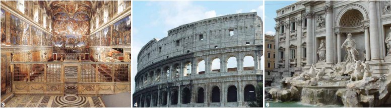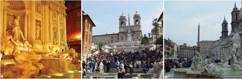이런 로마는 거리마다 관광 명소들이 자리잡고 있어, 오히려 천천히 걸으며 음미해야 할 도시 일지도 모른다. 포로 로마노와 콜로세움, 판테온, 트레비 분수와 스페인 광장, 바티칸의 성 베드로 성당과 미켈란젤로의 <천지창조>, <최후의 심판> 등 건축과 회화 그리고 조각이 어우러져 있어, 보는 이들을 역사의 기원과 예술의 심오함 속으로 안내하며 현재의 서양 문명을 가능하게 했던 모든 뿌리를 느끼게 해준다.