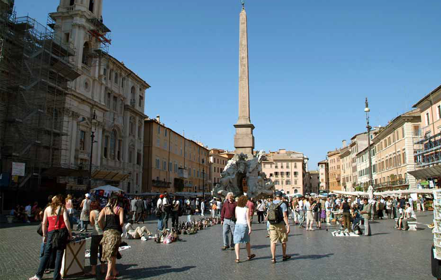 나란히 줄 맞춰 선 3개의 분수는 광장에 우아함을 더하는 3색 매력. 북쪽이 넵튠 분수, 가운데가 4대 강 분수, 남쪽은 무어 인의 분수다. 그 중에서도 베르니니가 만든 4대 강 분수에 가장 많은 사람이 몰린다. 4대 강을 상장하는 네 거인 중에 얼굴 가린 거인을 찾아보자. 베르니니가 자신의 라이벌 보로미니가 건축한 산타네세 인 아고네 성당이 보기 싫어 거인의 얼굴을 가렸다는 진짜 같은 거짓말이 전해진다. 산타네세 인 아고네 성당을 비롯해 우아한 바로크 양식의 건물들로 둘러싸인 타원형 광장은, 로마 공화정 시대 경기장이 있던 곳이다.