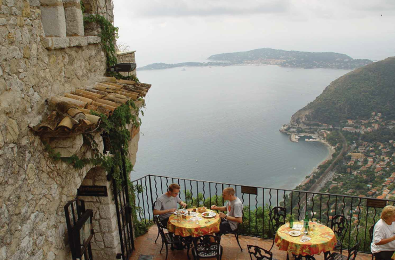 에즈의 지붕들을 내려다 보며 식사를 즐길 수 있는 곳이다. 테라스 주변의 나무들은 수령이 300년 이상 된 것이라고 한다. 돔 요리와 토끼 요리가 추천할 만 하다.