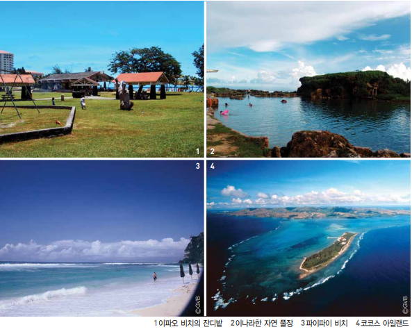 파란 하늘, 뭉게뭉게 피어나는 구름 아래로 뽀얀 속살을 드러내고 있는 깨끗한 해변. 진한 에메랄드 빛 바다 뒤로는 깊은 쪽빛 바다가 펼쳐진다. 눈부신 햇살이 쏟아지는 건 다른 남국과 같지만 해변과 하늘이 너무 맑아서 괌의 에메랄드 빛은 더욱 생생하게 다가온다.
