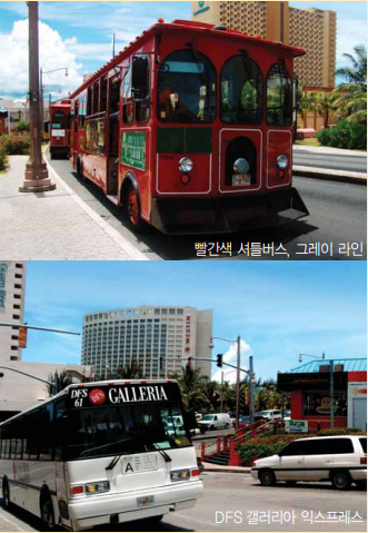 DFS 갤러리아에서 운영하는 전용 셔틀버스로 오전 9시부터 밤 11시까지 15분 간격으로 운행하며 주요 호텔들에서 정차한다. 4개 노선이 있으며 무료로 이용할 수 있다.