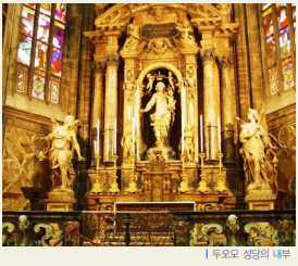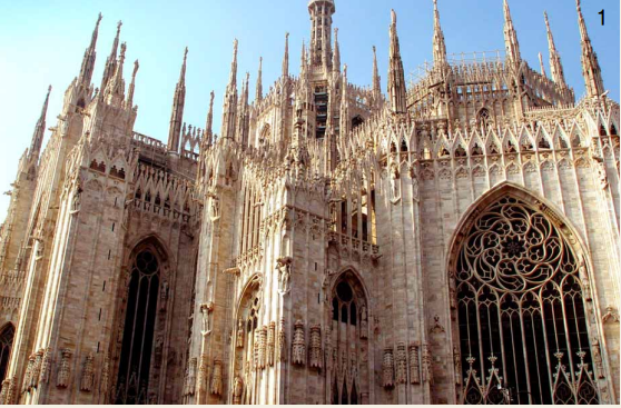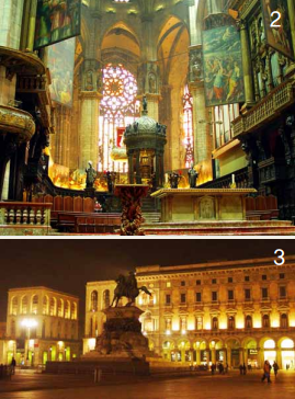 이탈리아에서는 각 도시 중앙에 위치한 대성당을 두오모Duomo라고 하고 그 외의 성당들은 끼에사Chiesa라고 한다. 밀라노에 있는 두오모는 이탈리아에서 바티칸의 성 베드로 성당 다음으로 큰 규모이다. 길이 157m, 폭 91m, 높이 108.5m이다. 1386년 지안 갈레아초 비스콘티Gian Galeazzo Visconti 공작의 명에 따라 착공되었다. 이탈리아뿐만 아니라 프랑스와 독일의 이름난 석공이 참여한 두오모 공사는 450 여 년에 걸쳐 진행되었다. 전반적인 설계는 프랑스 건축가였던 니콜라 드 보나방튀르Nicolas de Bonaventure와 이탈리아 건축가 필리피노 데 글리 오르가니Filippino degli Organi가 맡았다. 그래서 남유럽의 고딕 성당 중에서 알프스 이북의 요소가 많이 나타난다. 입장하기 전에 두오모 광장에서 고딕 양식의 정수라 불리는 아름다운 외관을 충분히 감상하는 시간을 갖는 것이 좋다.
